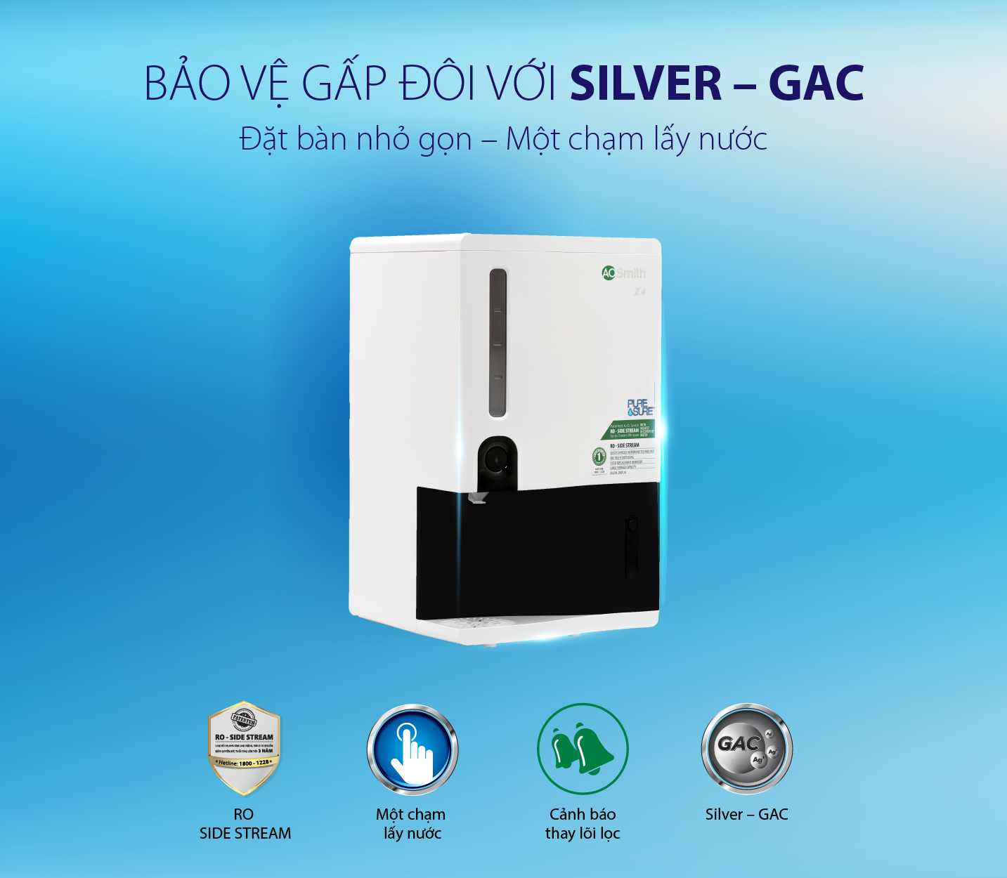 - Bảo vệ gấp đôi với lõi lọc Silver – GAC: Công nghệ diệt khuẩn bằng bạc tiên tiến giúp ngăn ngừa bất kỳ ô nhiễm, vi sinh vật tiềm ẩn sau khi lọc.Bảo vệ gấp đôi và đảm bảo nước luôn tinh khiết.Nước sau khi đi qua lõi tiền lọc, lõi lọc cặn lắng, lõi than hoạt tính, sẽ được lọc qua lõi lọc RO – Side Stream – trái tim của máy lọc nước Z4.Sau đó, để tạo vị ngon ngọt tinh khiết, nước sẽ đi qua lõi GAC để được khử mùi và điều chỉnh vị.Khác với lõi GAC thông thường, lõi GAC với tính năng bạc giúp diệt khuẩn thêm một lần nước, giúp bảo vệ gấp đôi nguồn nước tinh khiết.